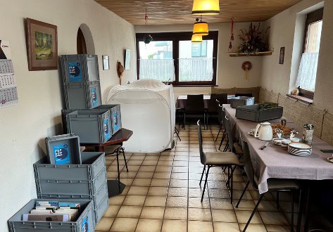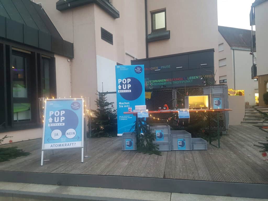 Seit April 2024 baute das POP-UP-MUSEUM auf Forschungen und Dokumentationen der Universität Tübingen und der Landesstelle für Alltagskultur auf. Von April 2024 bis Juni 2025 sammelte das Projekt mithilfe verschiedener partizipativer Formate nukleare Alltagskultur und damit verbundenen Erinnerungen und Zukunftsperspektiven in Kirchheim a. N., Neckarwestheim und Gemmrigheim, den Nachbargemeinden des GKN. Grundlage unseres Vorgehens war ein offener Sammelaufruf an die Menschen der Region, Boxen mit ihren Erinnerungen und Zukunftsentwürfen zu packen. Die Boxen sind Teil unseres im Strukturverbund „KulturWissen vernetzt“ entwickelten Ausstellungsmobiliars „museo mobile“, aus dem das POP-UP-MUSEUM KERNgeschichten entstand.